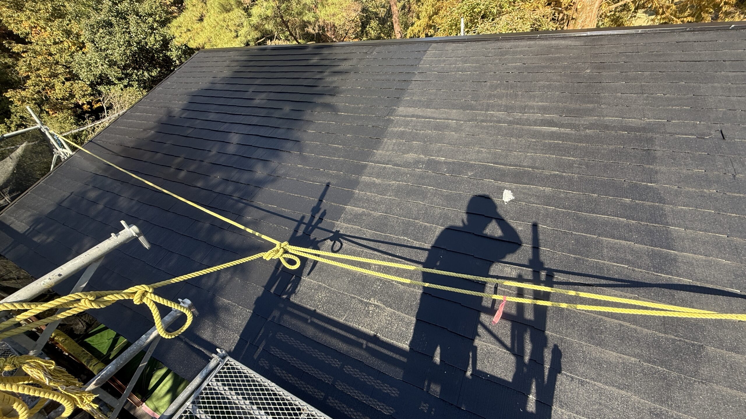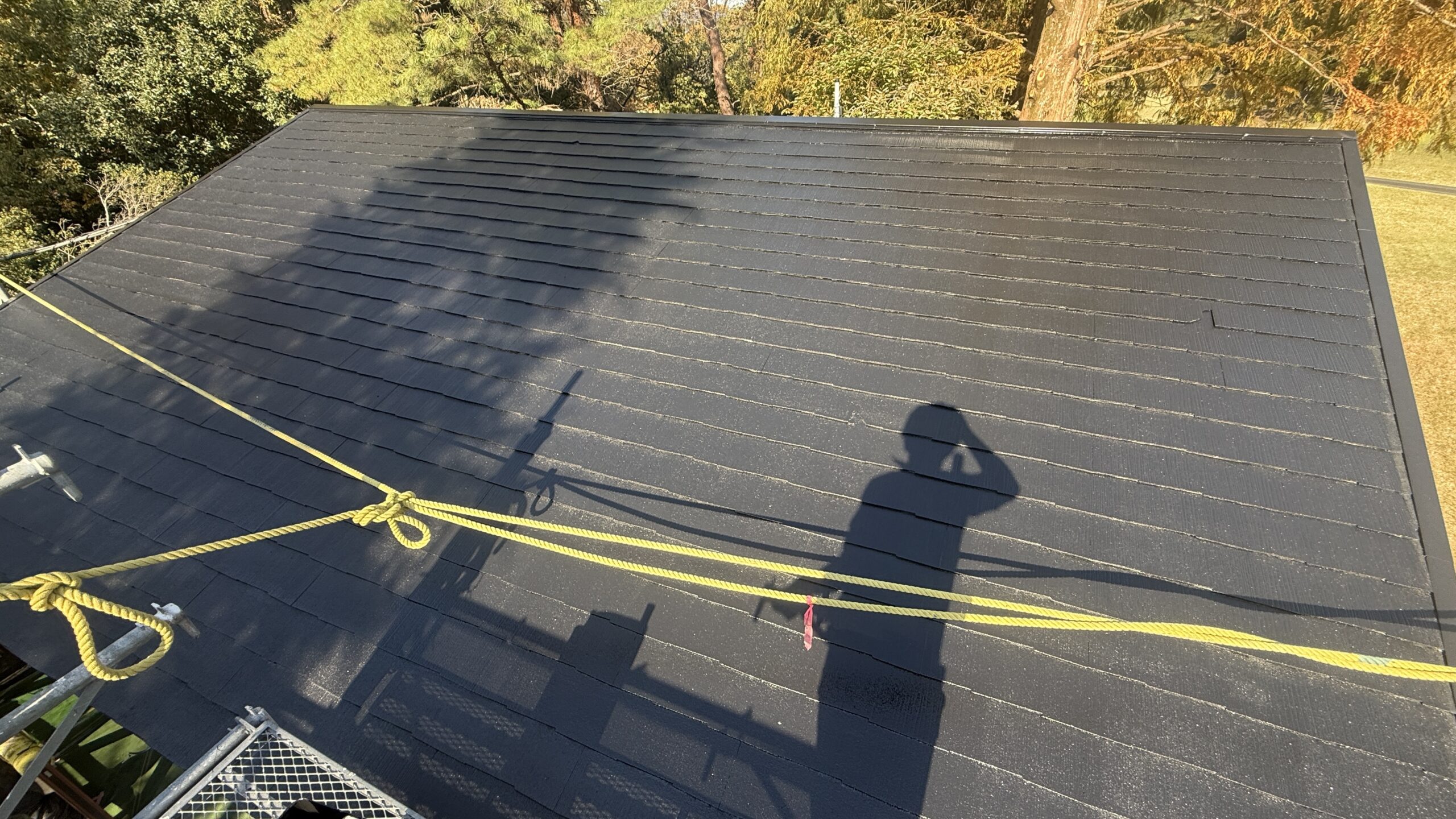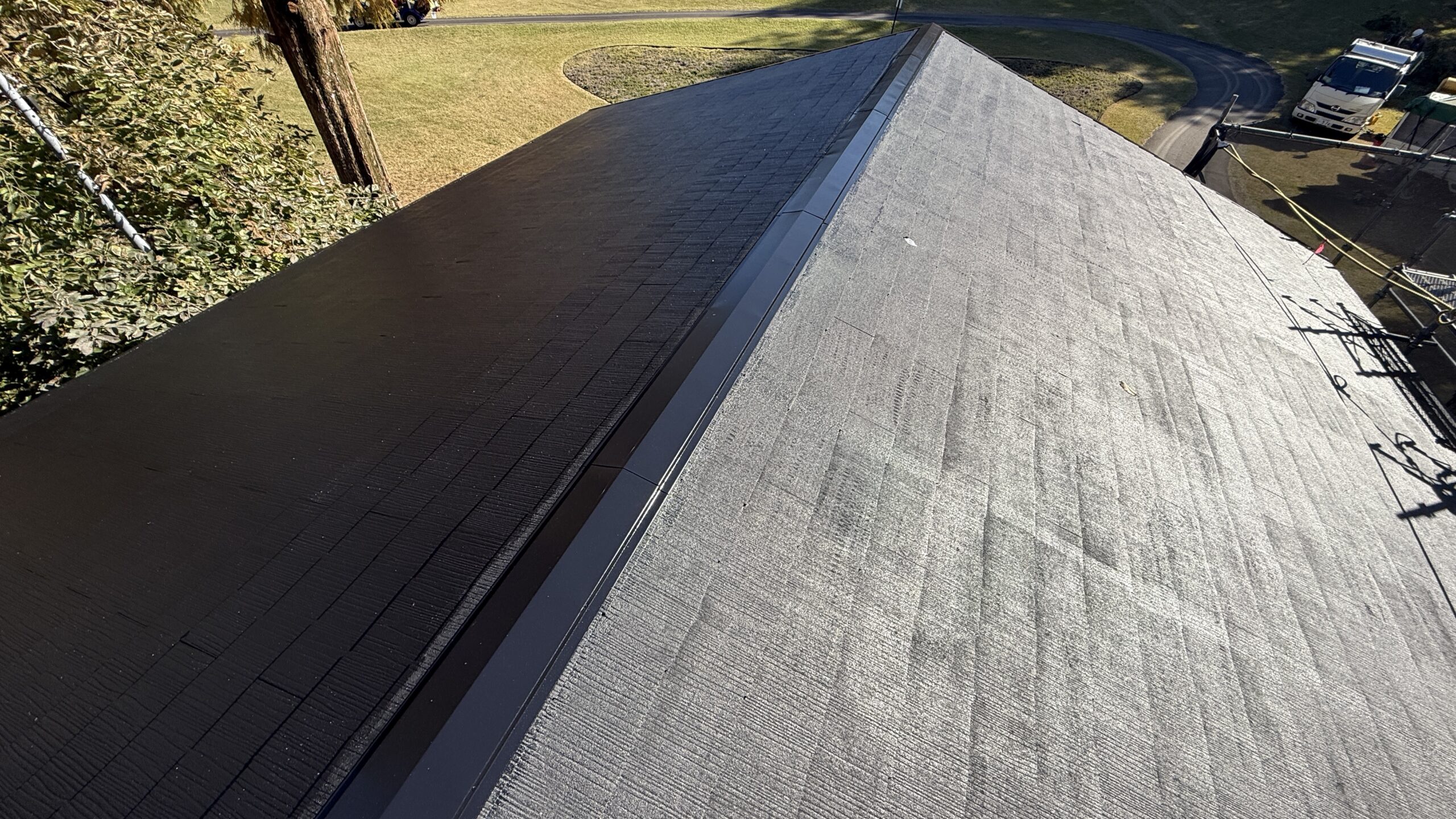 作業内容は屋根の上塗りです2面ある内の一面を塗り終えた時です!